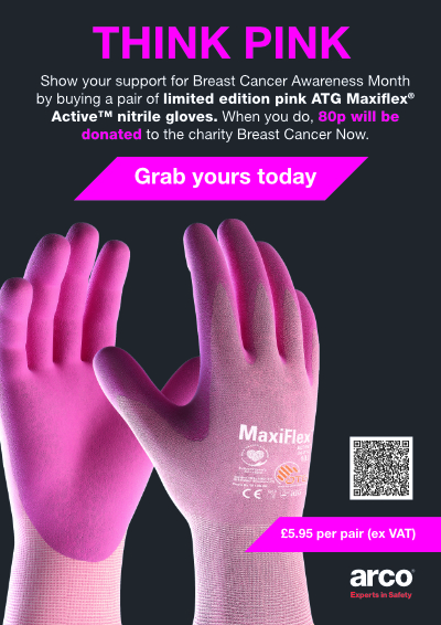 Arco is launching a one-off range of pink ATG Maxiflex® Active™ nitrile gloves in support of October's Breast Cancer Awareness Month. The initiative sees Arco collaborating with longstanding partner, Openreach, which will be providing 1,000 pairs of gloves to its engineers.